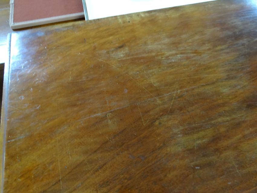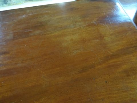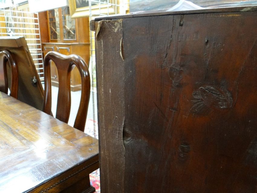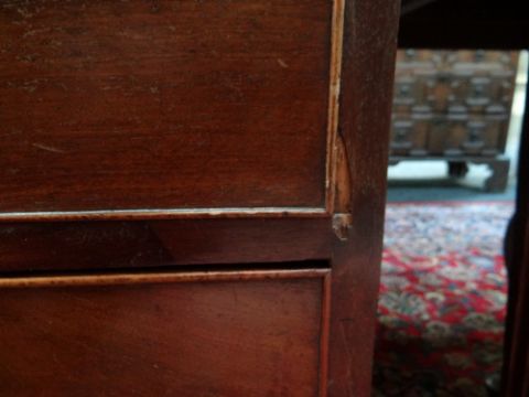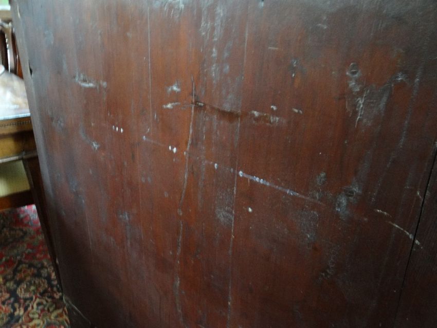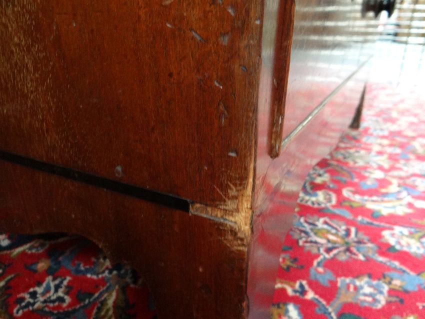19TH CENTURY MAHOGANY CHEST, fitted two short and three long drawers, draped apron between high bracket feet, 101h x 97.5w x 44cmsCondition: scratches, water marks and fading to the top. Also a split half way across.Both sides are faded, Veneer missing and beading missing to most drawers.Large split all down the back, held together with tape.Key missingHandles loose