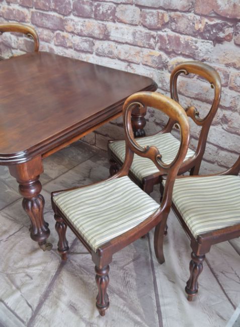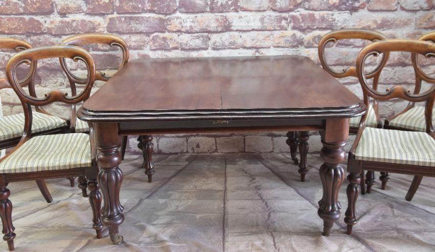 VICTORIAN WALNUT EXTENDING DINING TABLE & CHAIRS, moulded top above gadrooned baluster legs, brass caps and castors, six similar buckle back dining chairs with drop-in seats, table 172w x 119cms d (7)