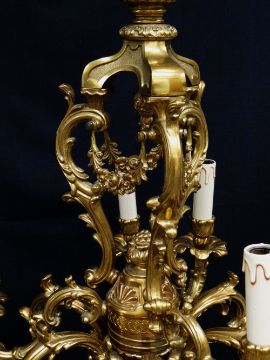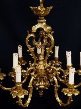 MODERN ITALIAN ROCOCO NINE-LIGHT BRASS CEILING LIGHT, triple acanthus scroll and floral swag centre, foliate S shaped arms and sconces, 74cms high x 70cms diameter
