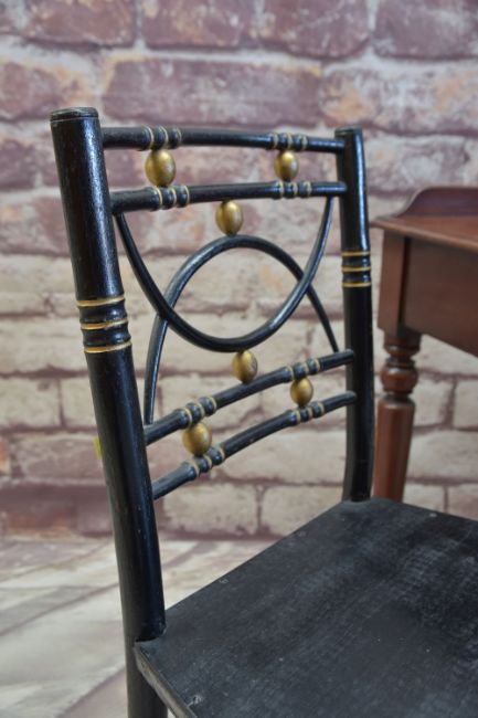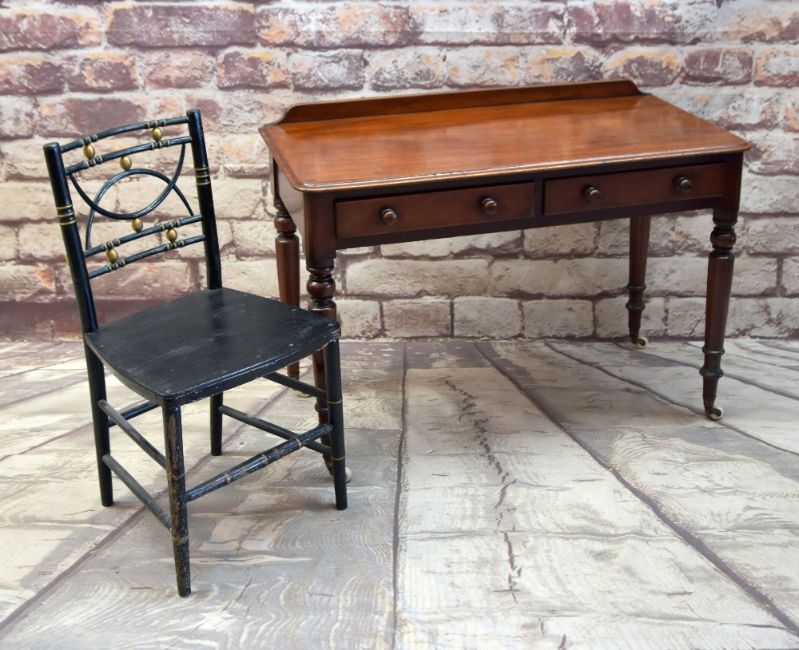 VICTORIAN WALNUT DRESSING TABLE & EBONISED CHAIR, table with moulded top above two frieze drawers on turned legs, ceramic castors, 77.5h x 107w x 53cms; chair in the Regency style and simulated bamboo (2)