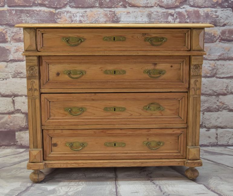 ANTIQUE PINE FOUR-DRAWER COMMODE, with art nouveau handles, moulded drawer fronts, carved uprights, bun feet, 100w x 54.5d x 86cms h