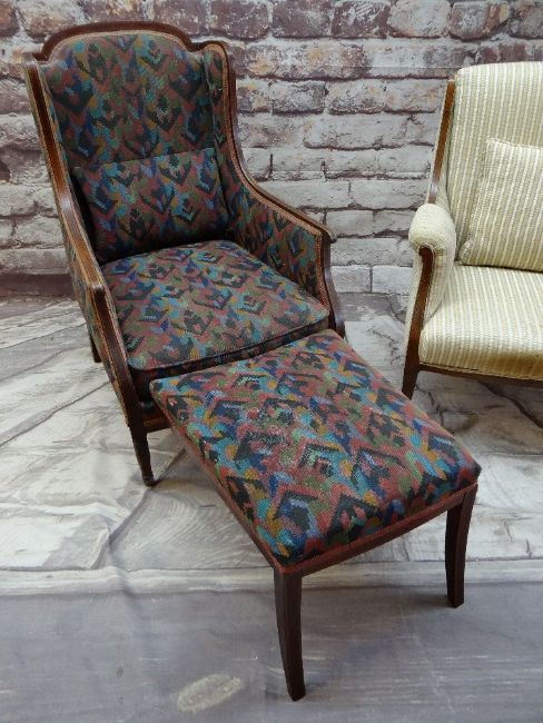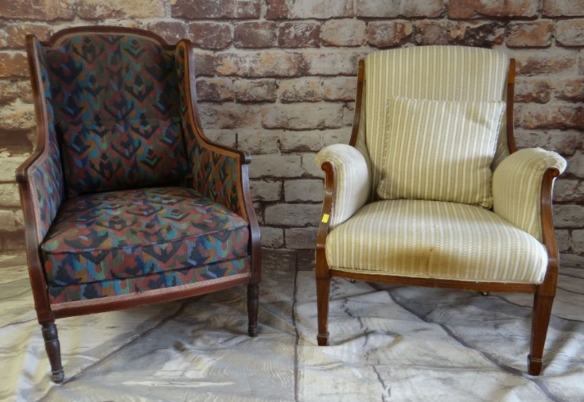 TWO EDWARDIAN MAHOGANY & BOXWOOD STRUNG ARMCHAIRS, one with concealed foldout footstool (2)