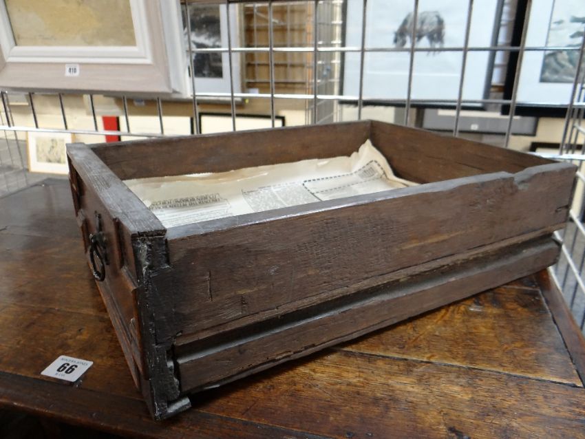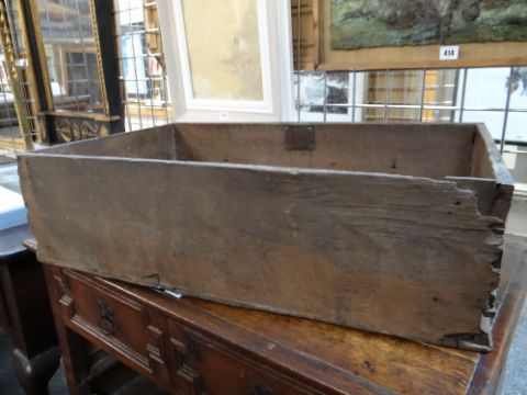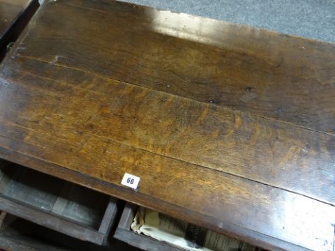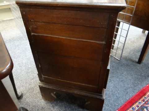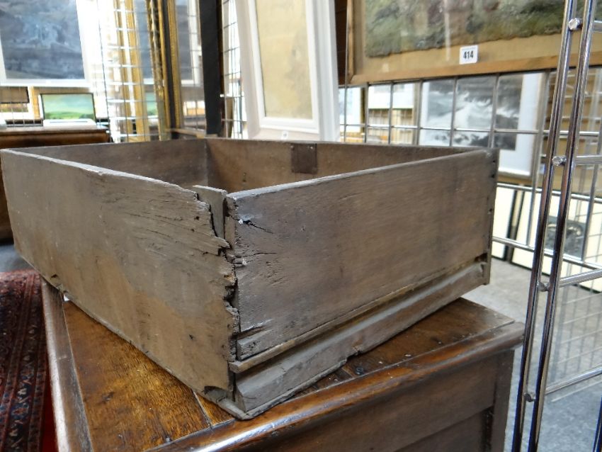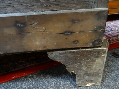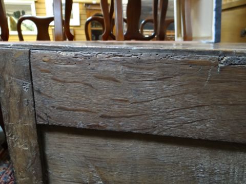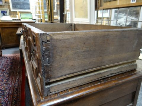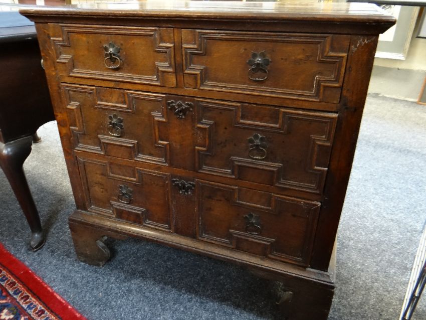 LATE 17TH / EARLY 18TH CENTURY GEOMETRIC JOINED OAK CHEST OF SMALL PROPORTIONS, boarded and moulded top above two short and two long mitre-moulded drawers, former with locking tongues, on high bracket feet, 80w x 48d x 78cms h Comments: Top with splits and shrinkage, generally good. Replaced handles and escutcheonssmall amount of worm on the back.All drawers slide well, handles look good, lock well and have no worm.It does feel a little wobbly on its feet when moved.The top has splits.