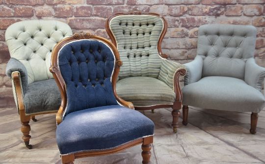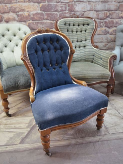 FOUR VICTORIAN BUTTON-UPHOLSTERED ARMCHAIRS, two in walnut with striped and navy upholstery, third in beech with two-colour grey upholstery, and another pale grey (4)