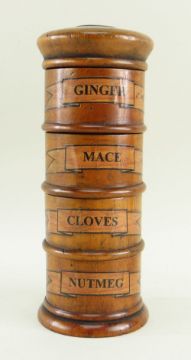 19TH CENTURY FOUR-DIVISION TREEN SPICE TOWER, the stacking turned boxes labelled respectively GINGER, MACE, CLOVES, NUTMEG, 20cms h