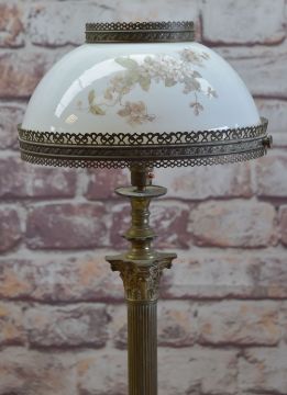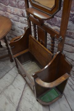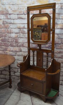 EARLY 20TH CENTURY OAK HALL STAND, GATELEG TABLE & STANDARD LAMP, hall stand with mirror, hinged seat and stick stands, 183cms high, table with oval top on barley twist legs, 149.5cms wide, telescopic Corinthian column lamp 130cms high (3)