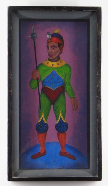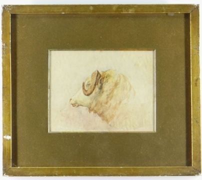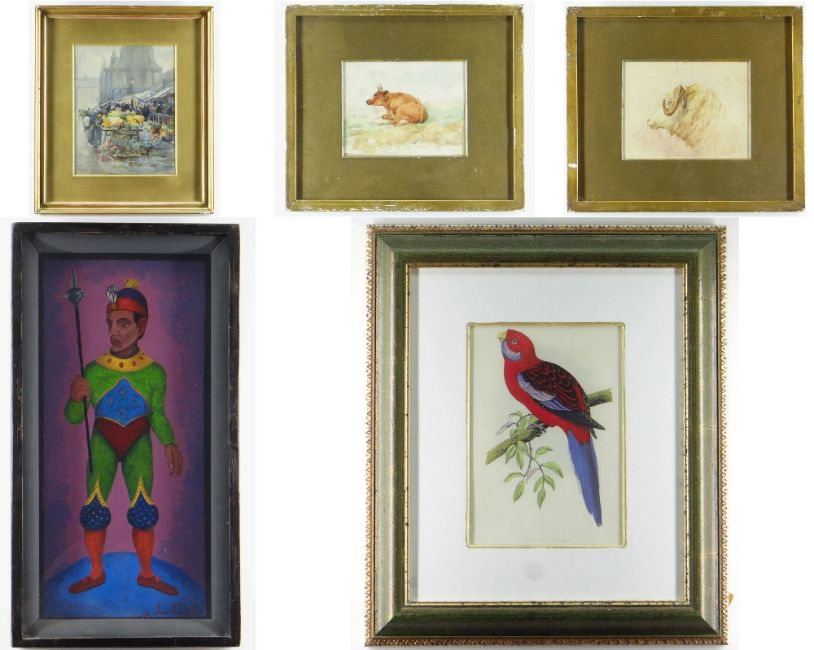 ASSORTED PICTURES & PRINTS including JACK TAYLOR (British, 20th Century) oil on board - 'Palace Guard II', signed and dated '54, Redfern Gallery label verso 'No. 37 1/2', detailing title, artist, purchaser (Webb Esq and date (June 14th 1954), 41.5 x 19.5cms, framed and glazed, three watercolours comprising pair of animal studies of a ram's head and a reclining cow, together with a watercolour of a market scene signed Ida Betts and a colour print 'Pennant's Parakeet', 26 x 18cms, framed and glazed (5)