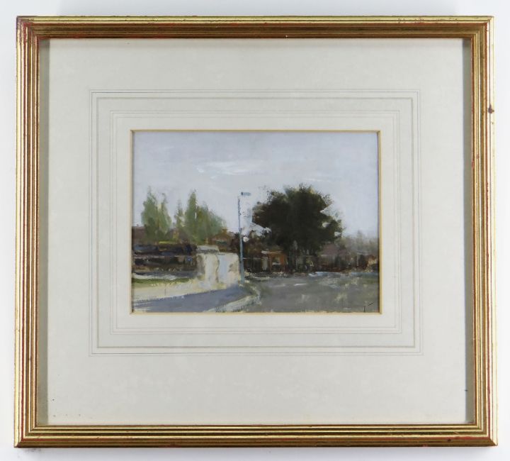 KEN MORONEY oil on paper - street scene with trees and lamp post, entitled verso 'London Street', signed, 14 x 19cms