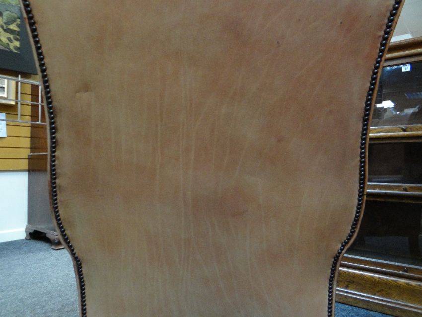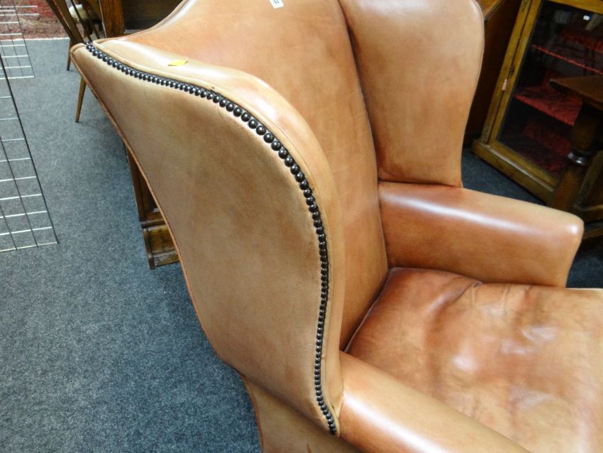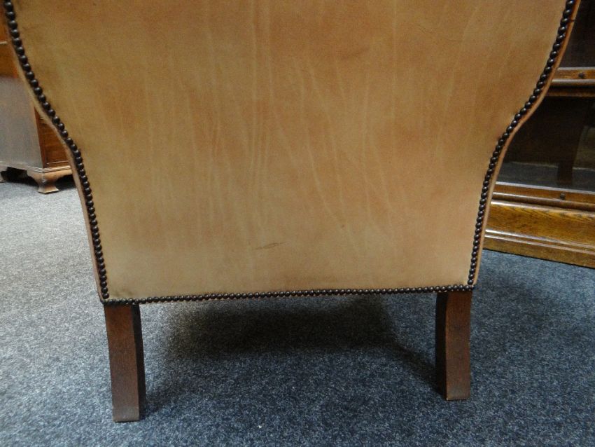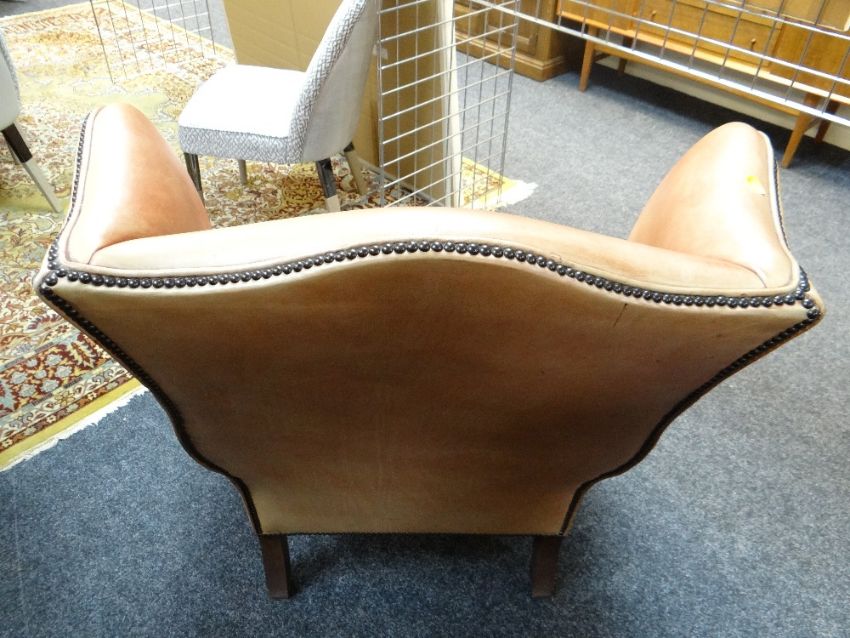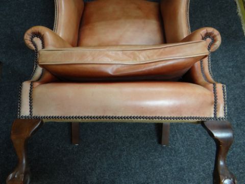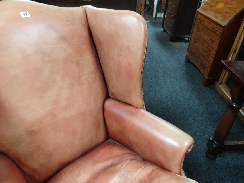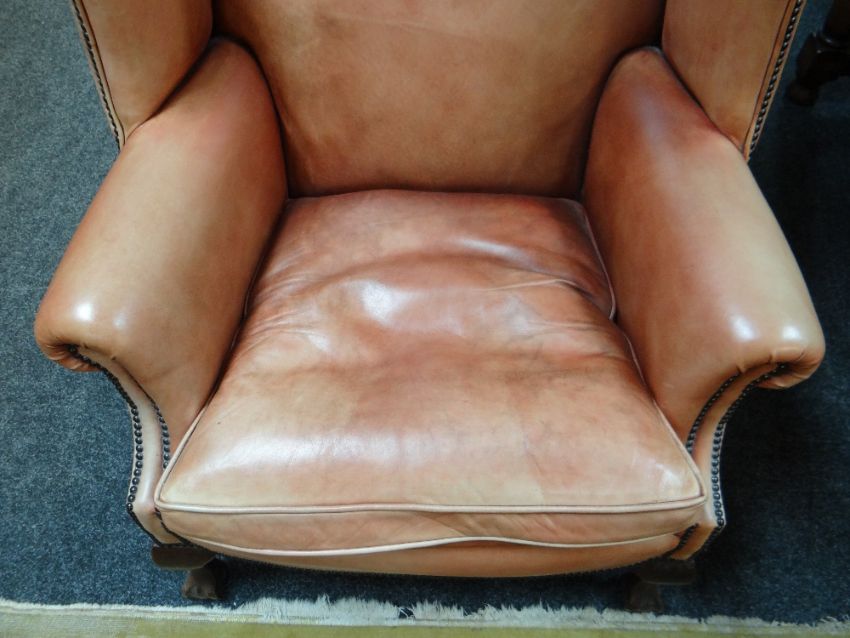 GEORGIAN-STYLE LEATHER WINGBACK ARMCHAIR, close -nailed faded red leather upholstery, claw and ball front legsAll good, no damage, light wear, just fading really. All studs present.Feels nice and solid, no wobble