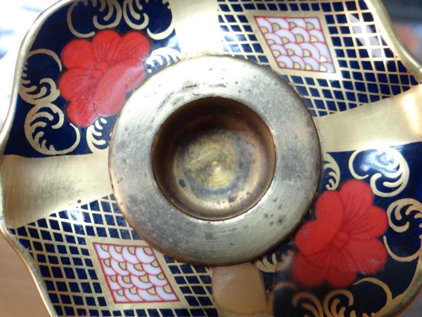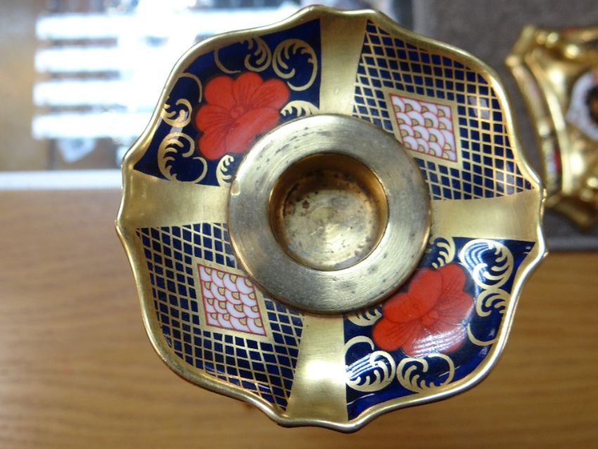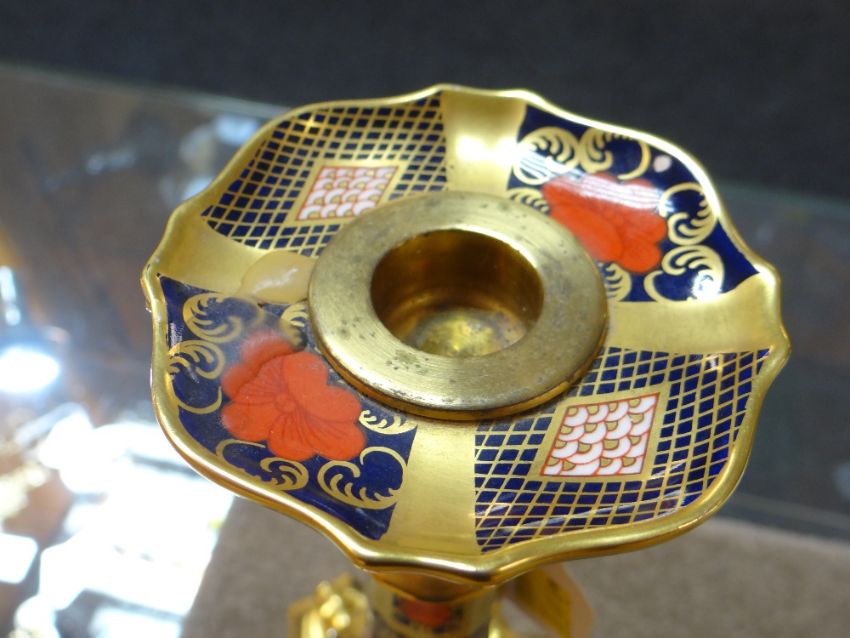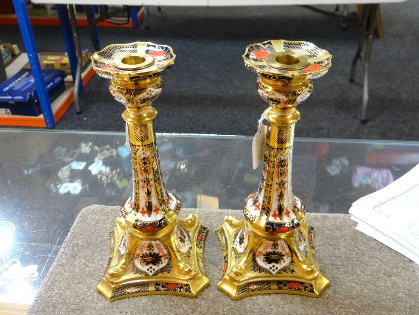 PAIR OF ROYAL CROWN DERBY IMARI CANDLESTICKS, pattern number 1128, printed marks to underside, 26.5cms high (2)There is no damage or restoration.There is slight gild wear around where the candle sits and there is wax on the catch plate showing that they have been used.I can only assume they are firsts due to the marking being nice and clear and scratch free.There is no box, they are sold as seen.