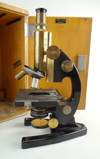 VINTAGE KARL ZEISS MONOCULAR MICROSCOPE, no. 178602, retailed by Andrew Baird (Edinburgh) with three objective lenses, various glass bottles and accessories, with original mahogany case