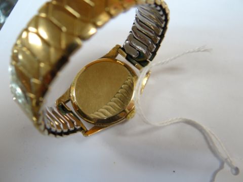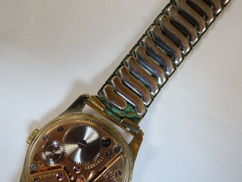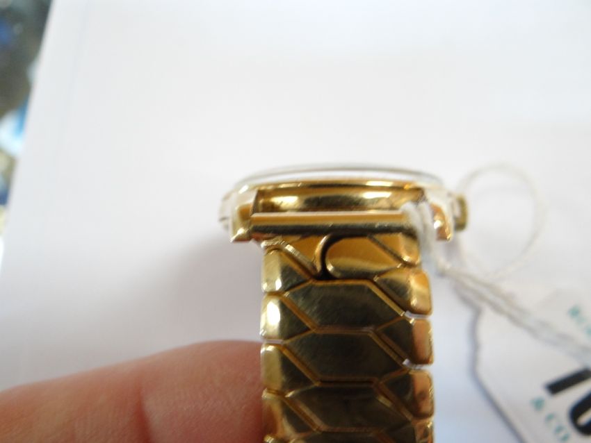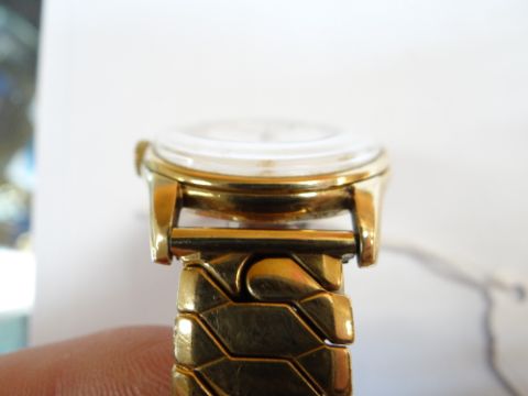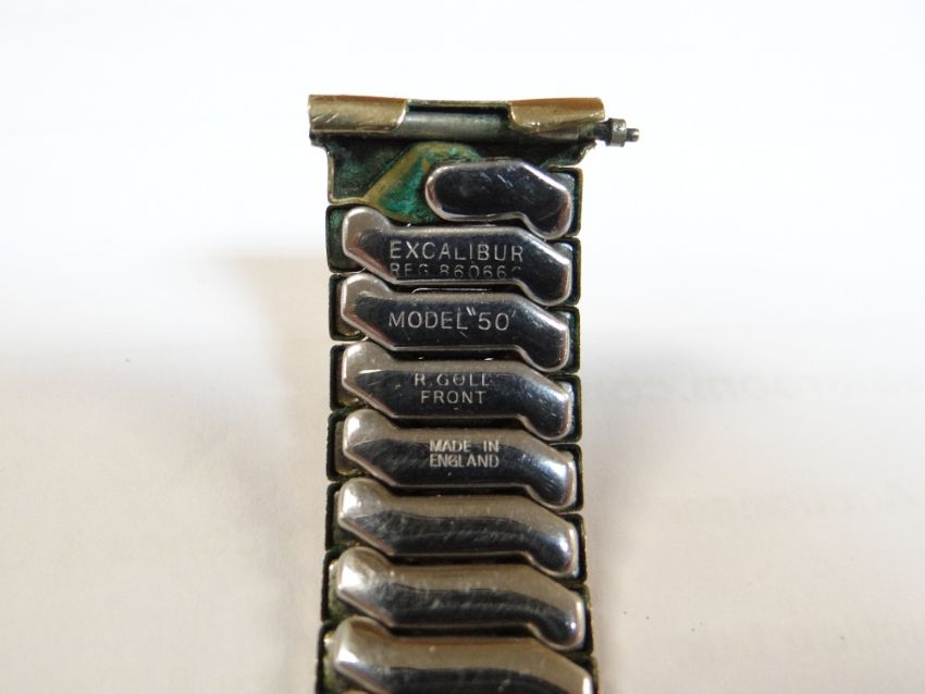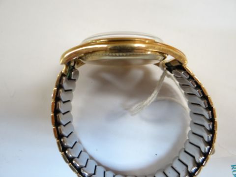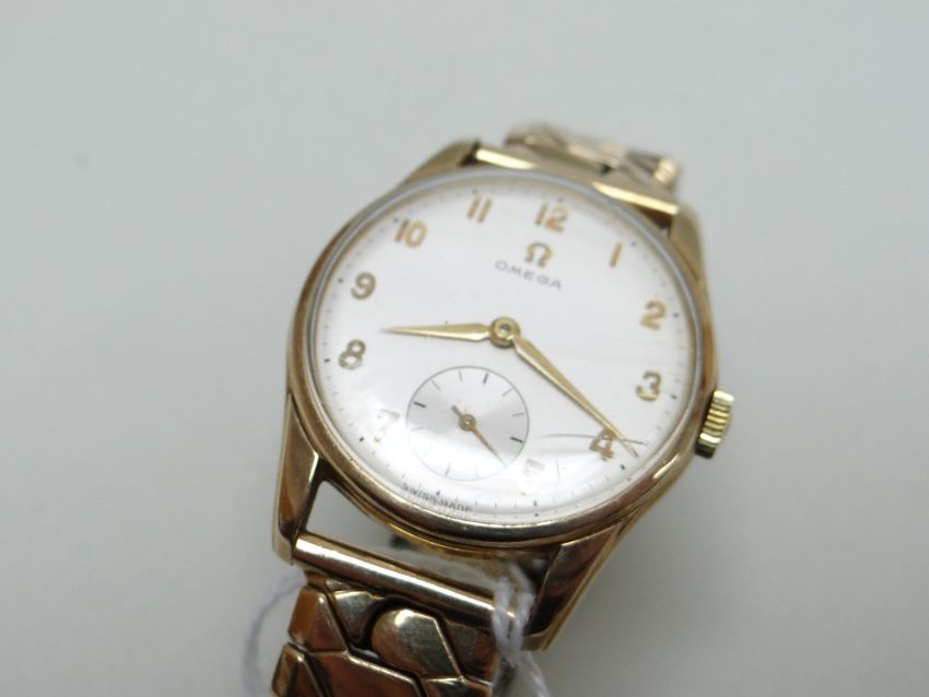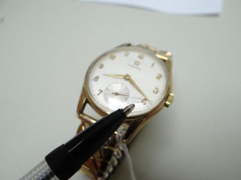 9CT GOLD OMEGA GENT'S WRISTWATCH, the 17 jewel movement numbered '17508220, cal. 268, hallmarked to inside back cover, 34mm case diameter, on expanding Excalibur model 50 rolled gold braceletThe watch winds and runs, unsure if it keeps time, the second hand is moving and the watch is ticking.The crown is marked with the omega symbol.There are surface scratches to the glass and what looks like a deep scratch to the lower right side.