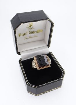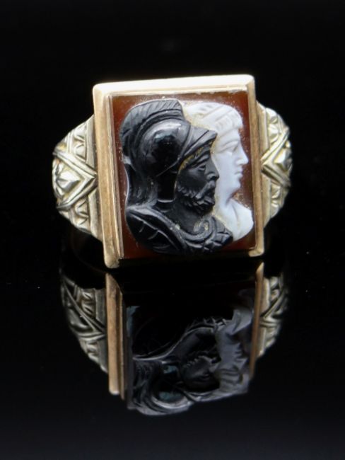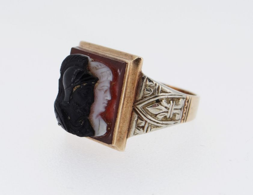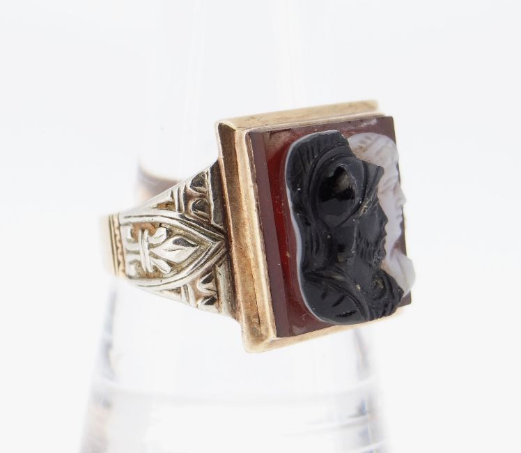10K GOLD HARDSTONE CAMEO RING, the square-shape sardonyx panel possibly depicting Hector & Achilles side head and shoulder portraits, ring size T, 6.7gms, in modern ring box