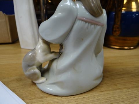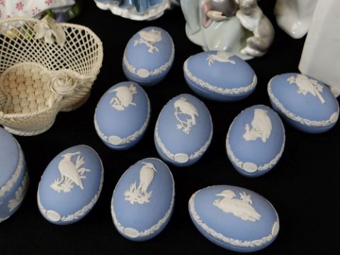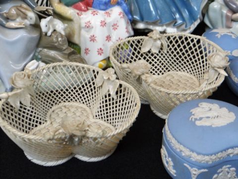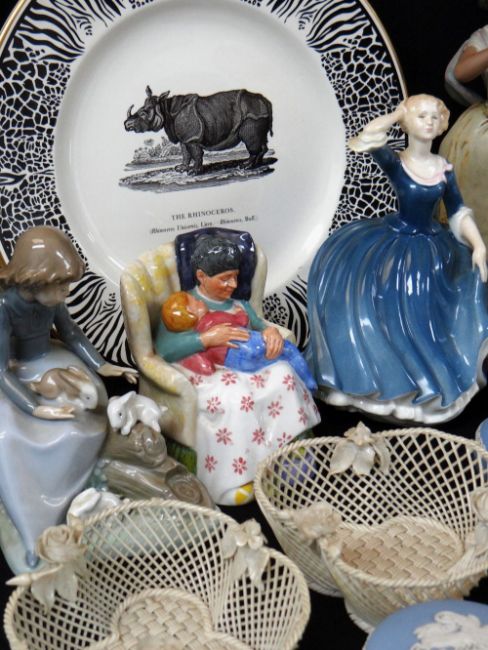 ASSORTED COLLECTORS CHINA, including pair Belleek trefoil baskets, 13cms diameter, ten Wedgwood jasperware boxes and covers, Battle of Britain commemorative dish, Prinknash Abbey Pottery Rhinoceros plate, two Doulton figurines (HN2380 and HN3494), and six Lladro/Nao figures Comments: Lladro stoneware figure restuck headThere is no other damage. Most pieces look like they have staining, could be dirt.All Doulton pieces are first quality.