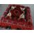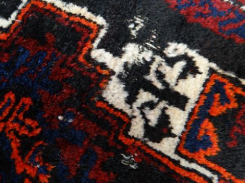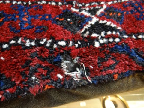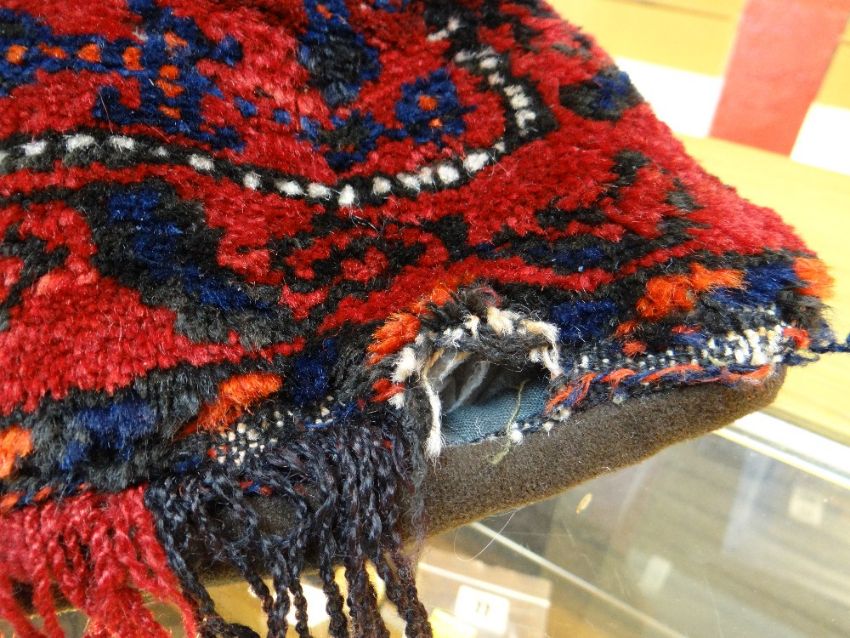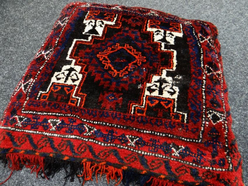 AFGHAN RUG CUSHION, red, cream, blue, orange and brown geometric decoration, fringe to one side, 70 x 70cmsThere are two holes, both in the sides.There is general wear all over.