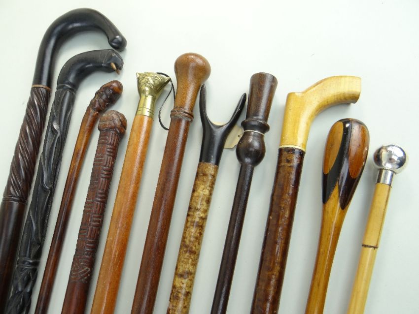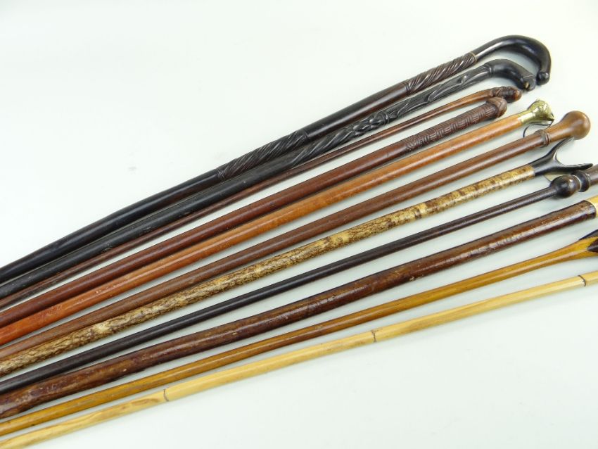 ASSORTED VINTAGE & MODERN WALKING STICKS / CANES, including a silver ball-handled bamboo cane, specimen wood-handled cane, two African ebony-caved sticks, ram's horn cleft stick, five others and an antique shotgun cleaning rod with brass jag (11)