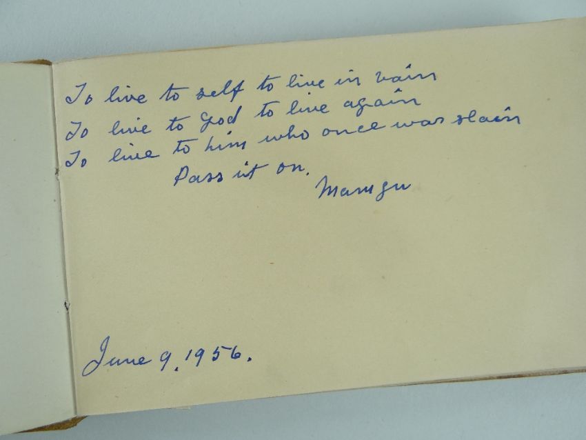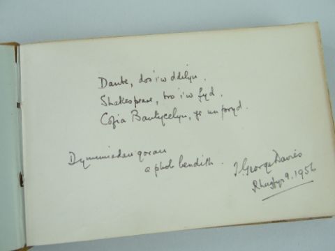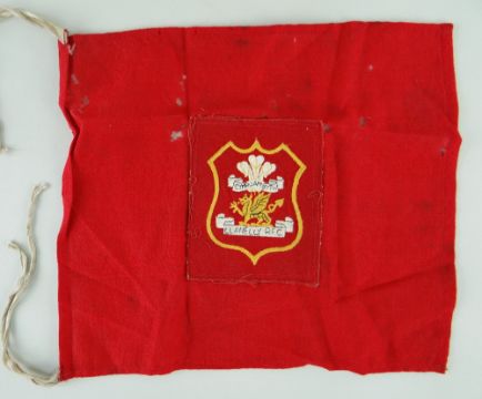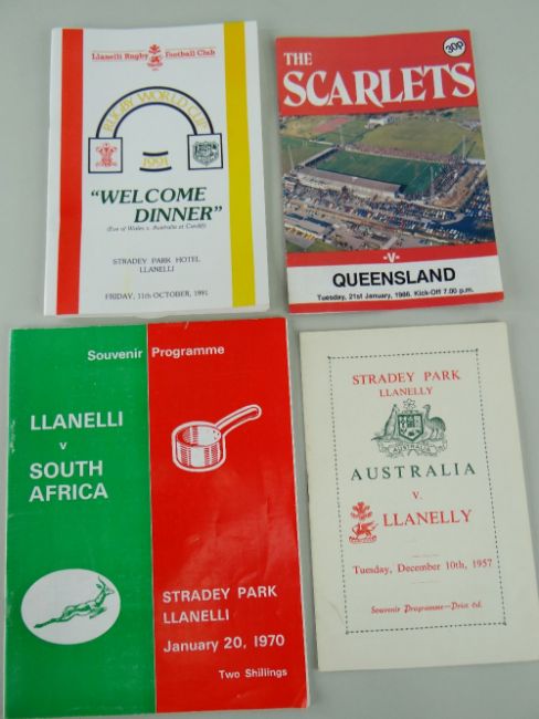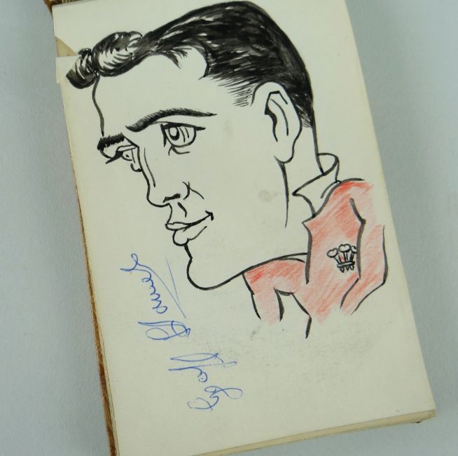 COLLECTION OF RUGBY UNION EPHEMERA FROM THE ARCHIVE OF PETER REES (1918-2020) the former Llanelli RFC & Wales player and Llanelli president, including a Llanelly RFC jersey badge re-sewn to red canvas, circa 1950s/60s, an autograph book with pen and ink caricatures of players with their signatures including Carwyn James, also page to Arsenal FC 1972/73 (eg. Charlie George, Bob Wilson, Alan Ball etc), Llanelly / Llanelli RFC programmes (eg. Australia v Llanelly 1957), dinner invitations etc