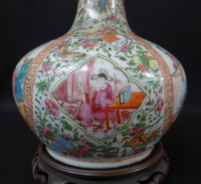 CHINESE CANTON FAMILLE ROSE PORCELAIN BOTTLE VASE, 19th Century, enamelled with opposing oval cartouches depicting courtiers within gilt keyfret borders, reserved on a ground of flowers, insects and precious objects, 31cms high