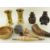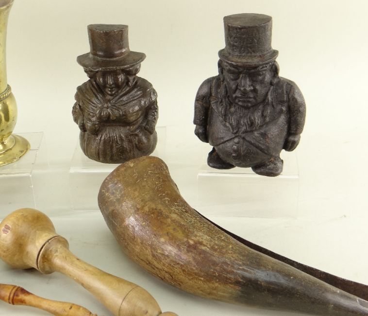 ASSORTED METALWARE & TREEN, including pair of polished bronze altar vases 16cms hight; Kruger money bank 14.5cms; Welsh Lady cast iron door stop 13cms high, cowhorn flask with metal clip 27cms long, turned mortar and pestle, treen salt spoon, Rajasthani chapati roller; lead horse paperweight 10cms diam. (10)
