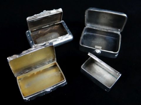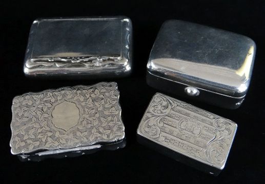 FOUR SILVER SNUFF BOXES comprising Edward VII rectangular engraved snuff box, Birmingham 1905, J H Hillcox, Edward VII rectangular snuff box with shaped border, Birmingham 1907, George V silver rectangular plain snuff box with striker to side, Birmingham 1910, W H Haseler, Victorian small silver snuff box with striker, engraved lid, Birmingham 1847, Frederick Marson, 100.4gmsoverall (4)
