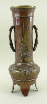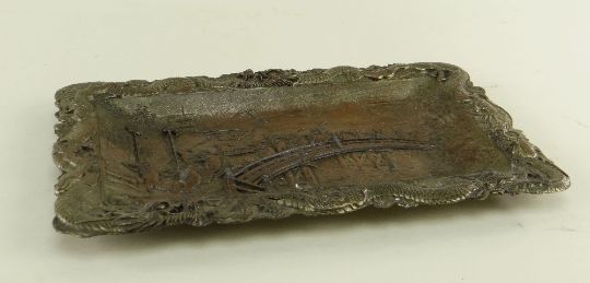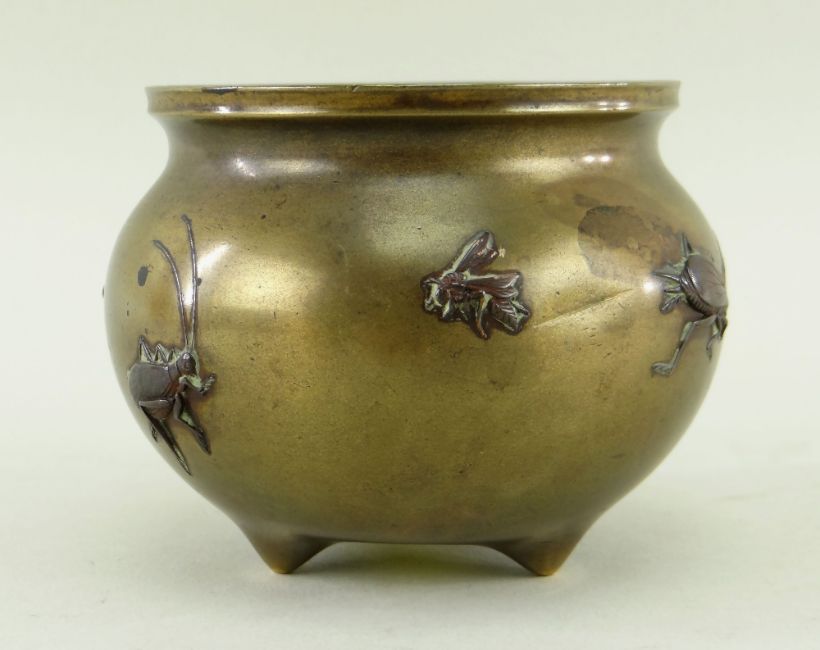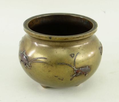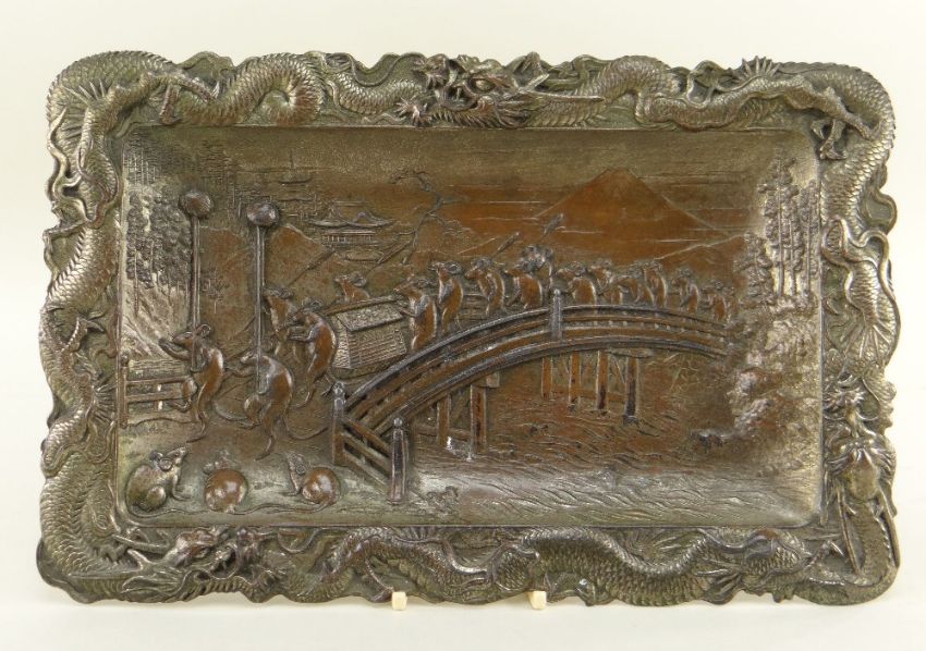 THREE ITEMS OF JAPANESE METALWARE, comprising silvered copper alloy tray decorated with procession of rats crossing a bridge within dragon borders, 335 x 215cms; bronze tripod koro with inlaid insects in iroe takazogan, 7.5cms high and a tripod vase with Reishi fungus handles, 24.5cms high (3)