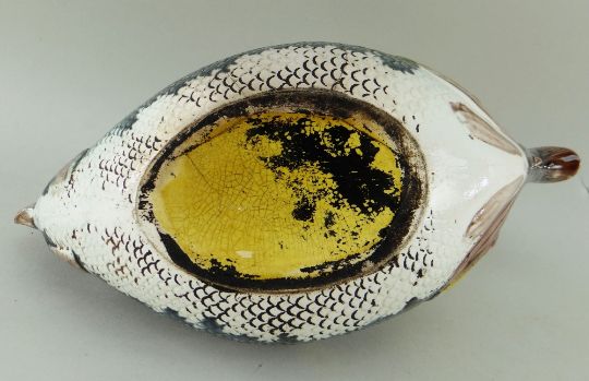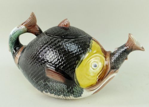VICTORIAN MAJOLICA FISH TEAPOT & COVER, the spout modelled as the tail of a small fish, 28cms long