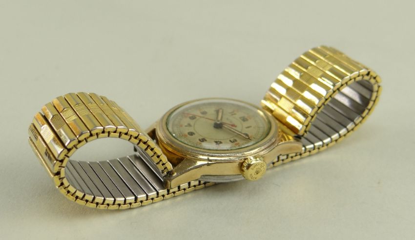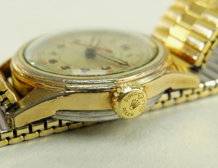 VINTAGE PLATED ROLEX WRISTWATCH, the dial with centre seconds hand, minute railroad, Arabic numerals, on expanding bracelet
