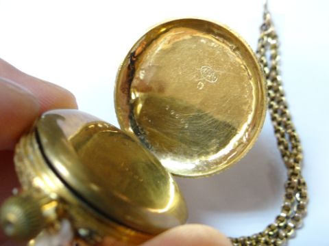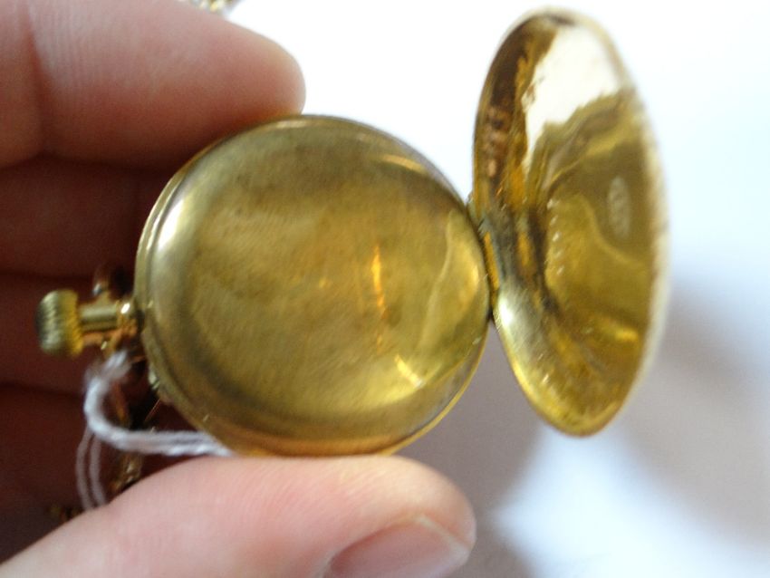 18K GOLD & ENAMEL SIDE WIND FOB WATCH, overall engraved, 36.4gms, together with yellow metal chain with tassel and hook, the Albert clasp stamped 9ct, 12.6gms