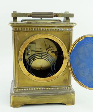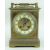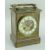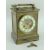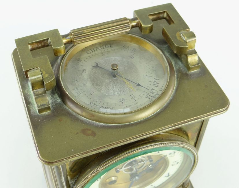 FRENCH BRASS COMBINATION MANTEL CLOCK in the form of an oversized carriage clock, the swing handle above an inset aneroid barometer marked 'Made In Paris', the front having an enamel chapter ring with Arabic numerals, visible regulation and balance wheel, two train movement striking a coiled gong, with winding key, 22cms highThe clock is not running, it looks like it was over wound. It is not ticking. The chime does work.Unsure if the barometer is working, the needle does move slightly when the top is tapped gently.