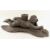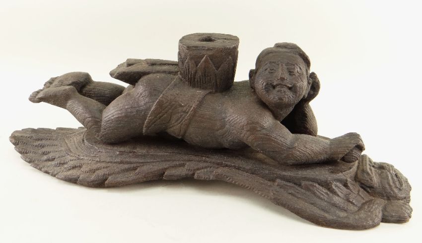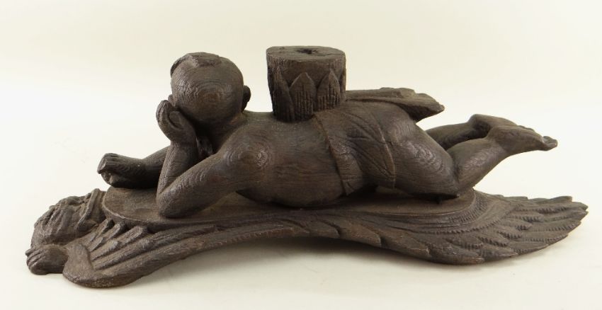 BURMESE CARVED WOOD ARCHITECTURAL FITTING carved as a figure recumbent on a winged deity or Nat, with socket in the back, 46cms long