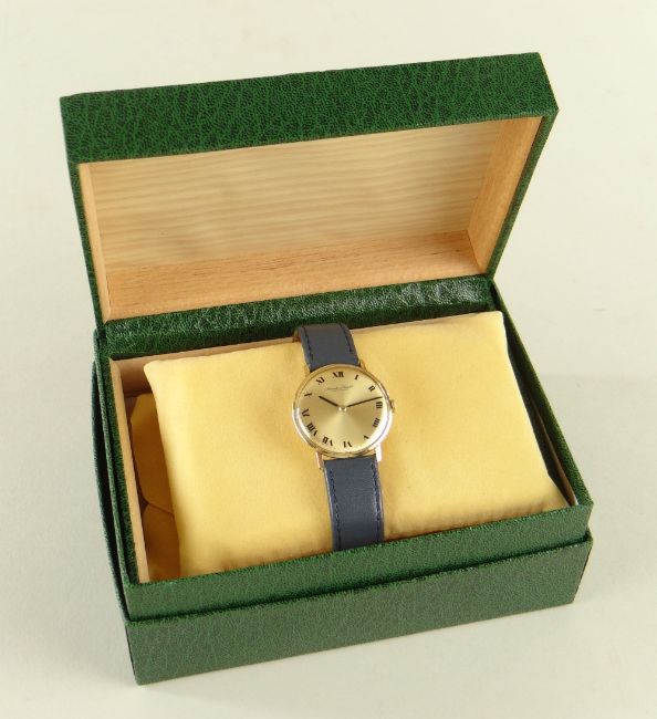 9CT GOLD IWC GENTS WRISTWATCH, the dial marked 'International Watch Co Schaffhausen' with Roman numerals, engraved to back cover 'C B C to J B C 7. 4. 72', 33mm case approx., with later leather strap, in later box