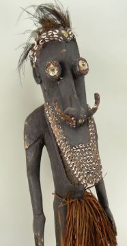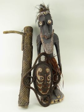 SEPIK RIVER STANDING FIGURE, 90cms and WOVEN FIBRE MASK, 50cms, a SOUTHEAST ASIAN BAMBOO CONTAINER, latter with woven rattan surface ornamented with lizards, 79cms h (3)