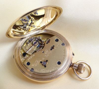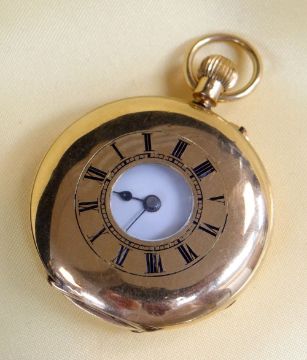LATE VICTORIAN 18CT GOLD HALF HUNTER FOB WATCH, case back with engraved initials, the white enamel dial with Roman numerals, the movement numbered '56784' and marked 'Vine & Thompson 85 Aldersgate St. London' London 1899, 46.4gms