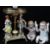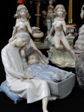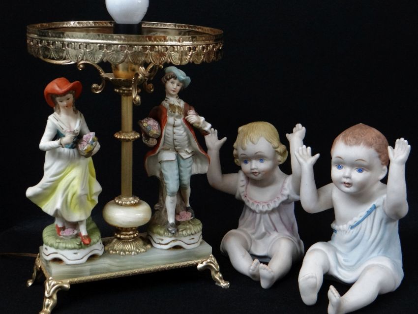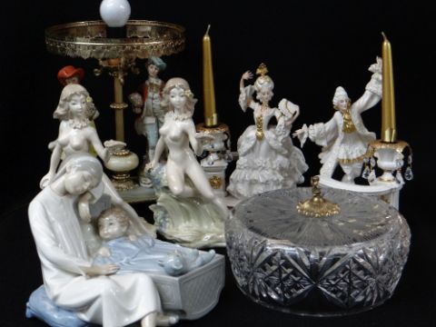 ASSORTED CONTINENTAL CHINA FIGURES, including pair bisque piano babies, pair 'House of Faberge' candlestick figures, Nao bedtime group, two sea nymph figures, and figural table lamp with cut glass shade (8)