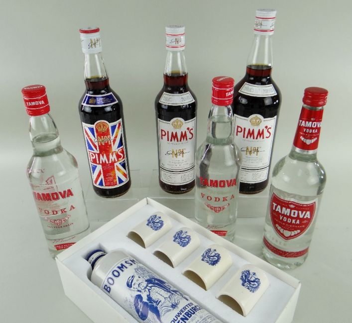 ASSORTED VODKA, PIMMS & KRUIDENBITTER, including Aldi Tamora x 3, Pimms x 3 including a 1litre bottle, and boxed Boomsma Dutch gin with four ceramic cups (7)