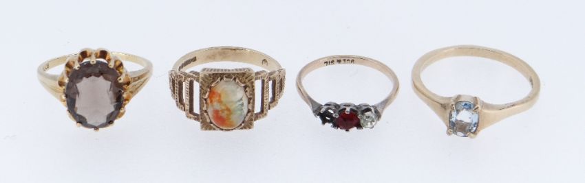 FOUR GOLD GEM SET RINGS comprising three 9ct gold rings and a 14ct gold ring, 11.1gms overall (4)