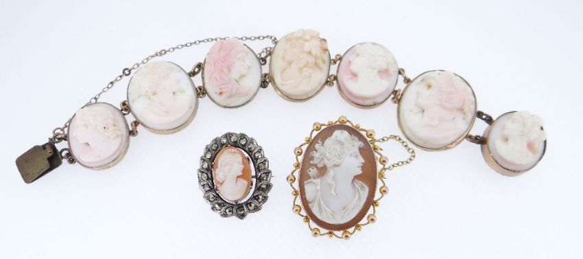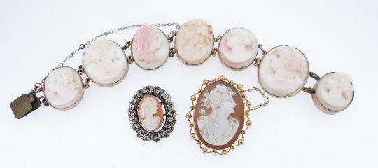 SEVEN-PANEL RELIEF CARVED CAMEO BRACELET, depicting side portraits of classical ladies, in unmarked yellow metal, probably late Victorian, together with 9ct gold set carved cameo brooch and another in silver marcasite setting (3)