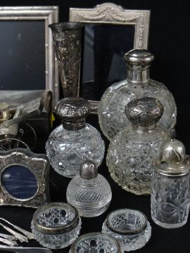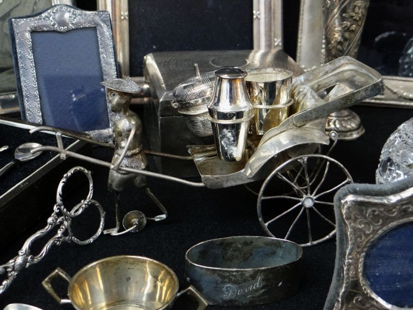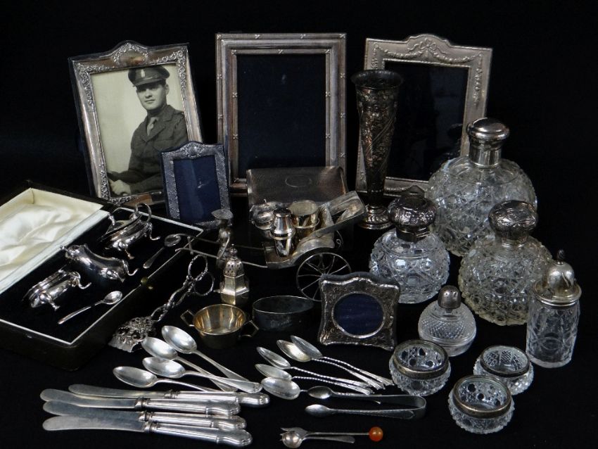 ASSORTED SILVER & CUT GLASS ORNAMENTS including Copeland porcelain flask with silver cover, Chinese silver table cruet modelled as a man pulling a sedan chair, silver cigarette box, five silver photo frames, boxed plated cruet, boxed pickle forks, various silver teaspoons, fruit knives, cut glass, cruets and eau de toilette bottles ETC