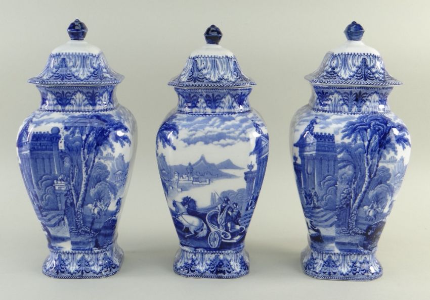 SET OF THREE CAULDON 'BLUE CHARIOTS' BLUE & WHITE' PRINTED BALUSTER VASES & COVERS of tapering square section with chamfered angles, 25.5cms high