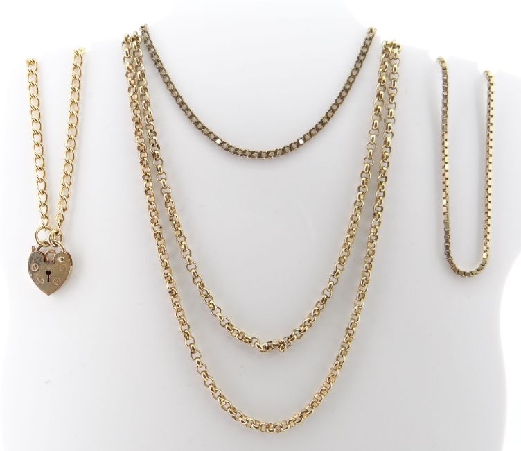 ASSORTED 9CT GOLD JEWELLERY comprising 9ct gold necklace, 57cms long, together with three 9ct gold fine bracelets, one with heart shaped padlock, 16.4gms overall (2)