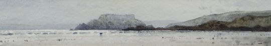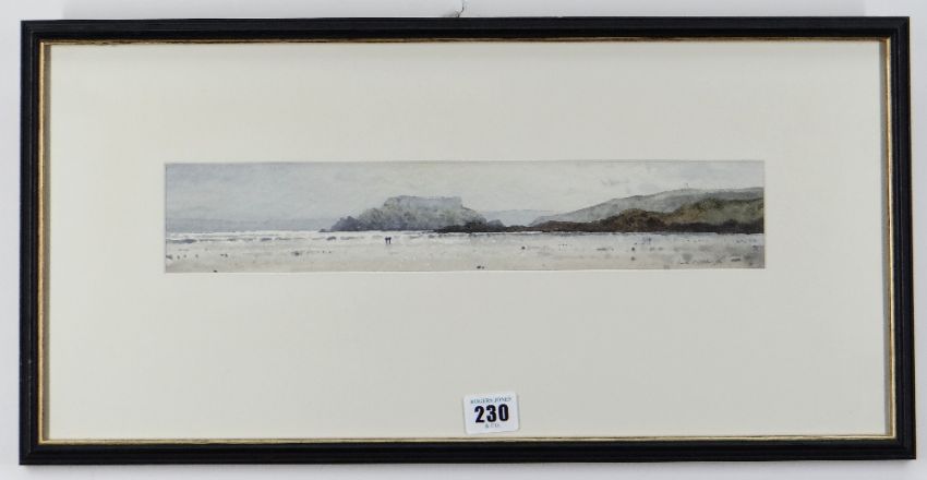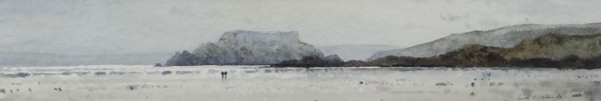 GARETH THOMAS watercolour - two figures on a Pembrokeshire beach, entitled verso 'The Beach, Angle', signed, 7 x 36cms