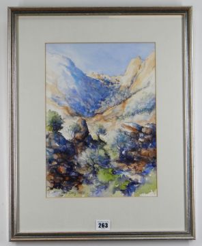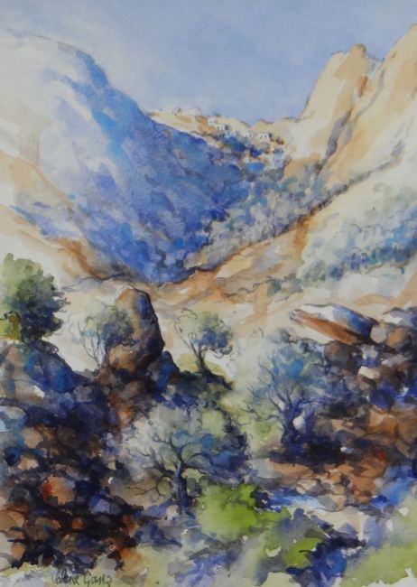 VALERIE GANZ watercolours, a pair - Cypriot landscapes, one with small church, the other with distant village, signed, 33 x 24cms