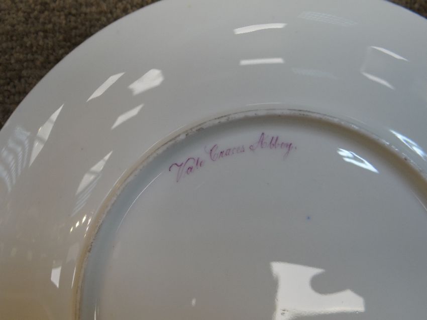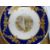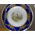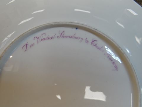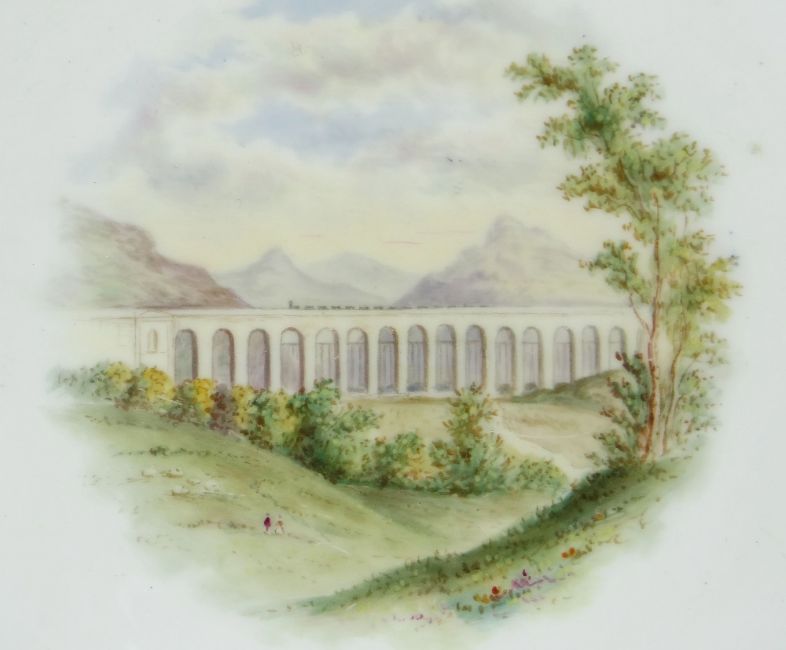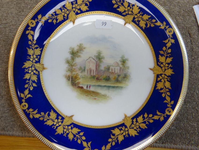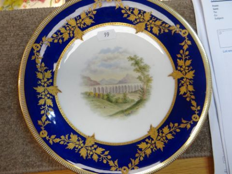 A STAFFORDSHIRE PORCELAIN DESSERT SET PAINTED WITH NAMED WELSH VIEWS having deep blue borders and vines of gilding and gilt decorated rims, comprising tazza raised over a pierced and acanthus scroll-foot base, and six plates, views named as 'View Near Aber, Caernarvon' (tazza), 'Rhaeadr Ewynnol or Swallow Fall', 'Aber, Waterfall', 'Bala Lake', 'Vale Graces Abbey', 'Ogwen Loch', 'The Viaduct Chester and Shrewsbury Railway', 23.5cms diam