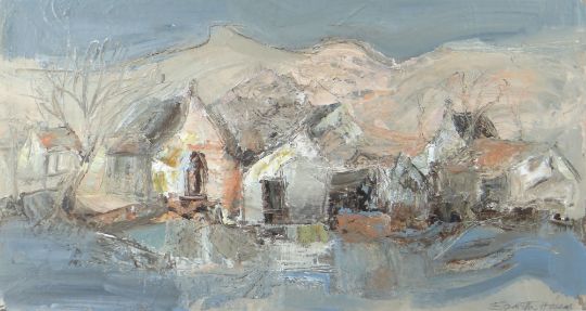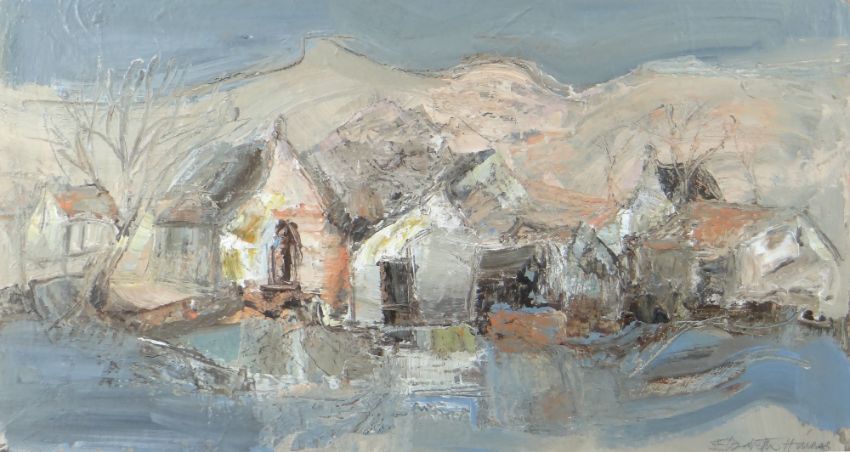 ELIZABETH HAINES oil on board / card - landscape, entitled verso 'Dwellings under a Mountain', signed, 24 x 45cms