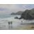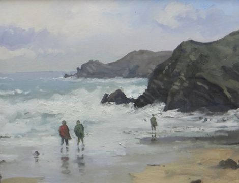 GARETH THOMAS oil on canvas - rocky coastalscape with breaking waves and three fisherman, signed in full, 39 x 49cms