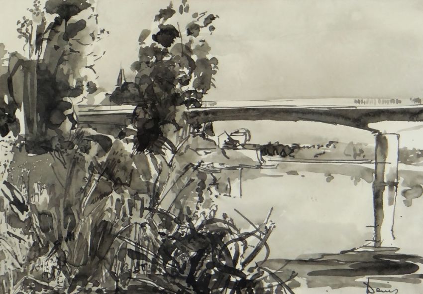 DENIS MATHEWS inkwash - landscape, entitled verso 'Bridge Across the Loire, Nr Saumur', dated 1983, signed, 20 x 28cms