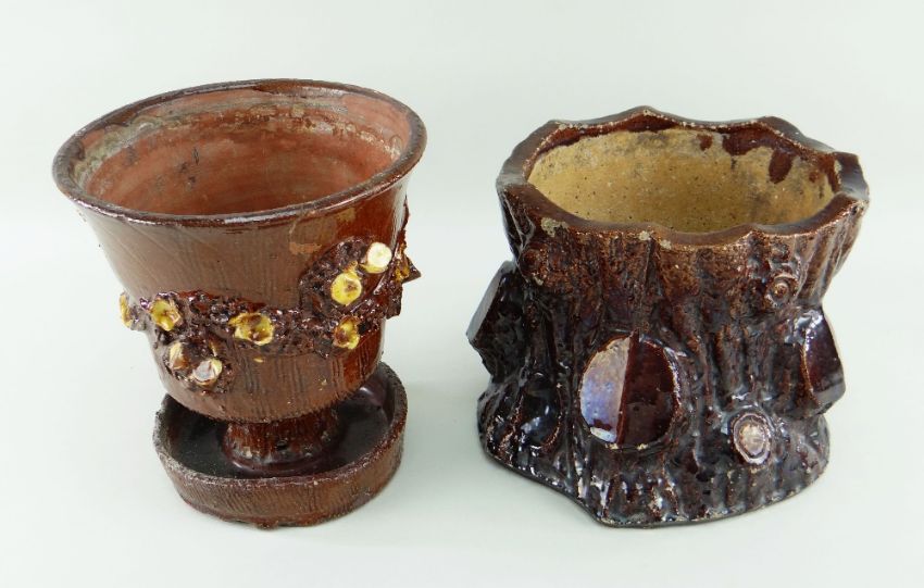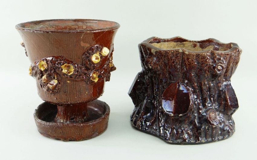 TWO BUCKLEY POTTERY PLANTERS the principle of pedestal form over drip-dish, both in brown glaze and naturalistic form mimicking tree trunks, unmarked, 23cms and 18cms