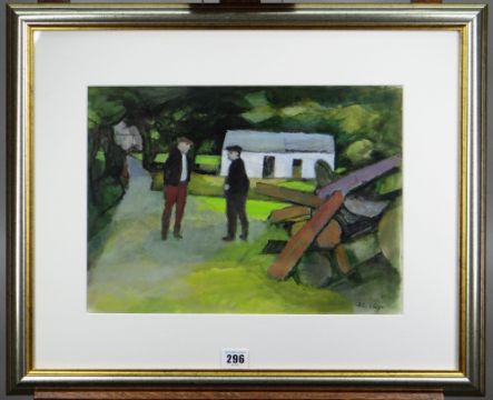 JOHN ELWYN gouache and acrylic on paper - two figures talking in a garden with whitewashed outbuilding, entitled 'Up to Date Gossip', circa 1985, signed, 27 x 36cms