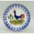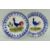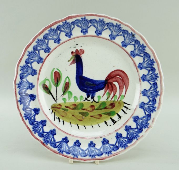 TWO CIRCULAR LLANELLY POTTERY COCKEREL PLATES, blue border and the cockerels blue with red tails, each 24cms diameter and with kiln stand marks to the base