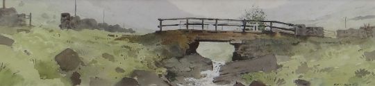 GARETH THOMAS watercolour - landscape with old footbridge over a river, signed, 12 x 51cms